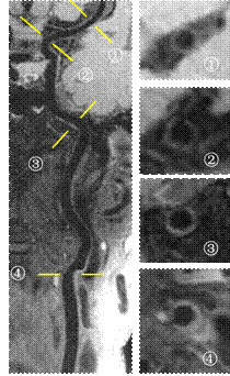 脑动脉和颈动脉血管壁联合成像。左侧图像为曲面后重建图像显示颈总动脉、颈内动脉和脑动脉血管壁全景。右侧为不同部位(①~④)的横断面图像显示颈内动脉近分叉处斑块形成以及③附近的早期动脉粥样硬化病变(血管壁增厚)。空间分辨率0.6 mm各向同性,扫描时间8分钟。